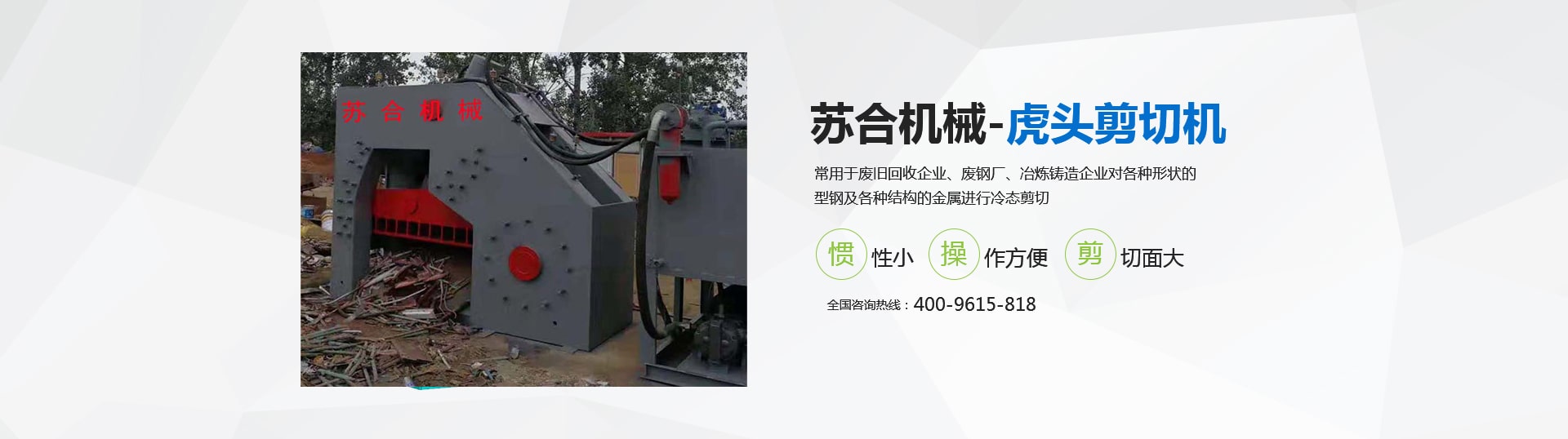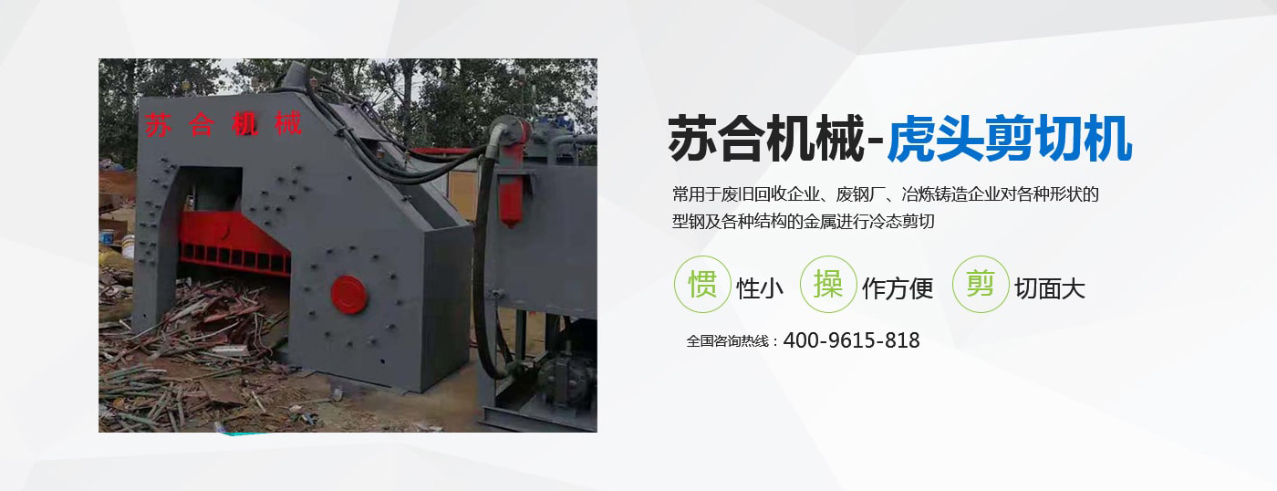 虎頭剪具有體積小、重量輕、慣性小、噪音低、動作平穩(wěn)、操作方便、靈活、剪切斷面大、剪刀口調整方便等優(yōu)點,操作使用安全。常用于廢舊回收企業(yè)、廢鋼廠、冶煉鑄造企業(yè)對各種形狀的型鋼及各種結構的金屬進行冷態(tài)剪切。剪切機的用途就是用來剪切定尺、切頭、切尾、切邊、切試樣及切除軋件的局部缺陷等。 滑縣蘇合機械制造有限公司性能穩(wěn)定,操作簡單。歡迎來電咨詢 <了解更多>
